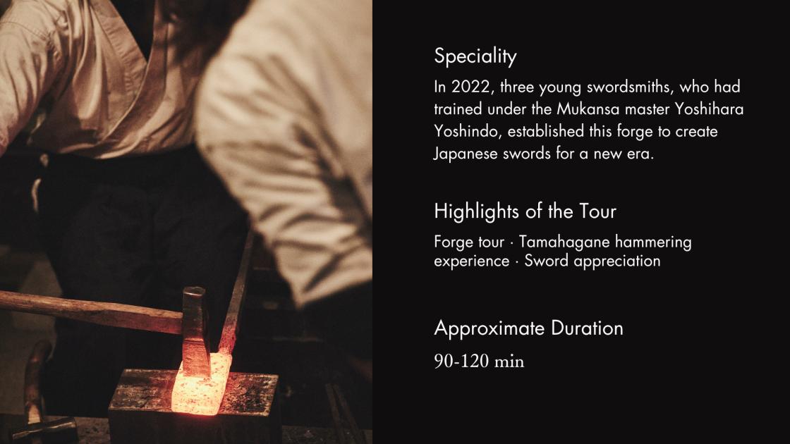 In 2022, three young swordsmiths who trained under Mukansa master Yoshihara Yoshindo founded this forge to create Japanese swords for a new era.