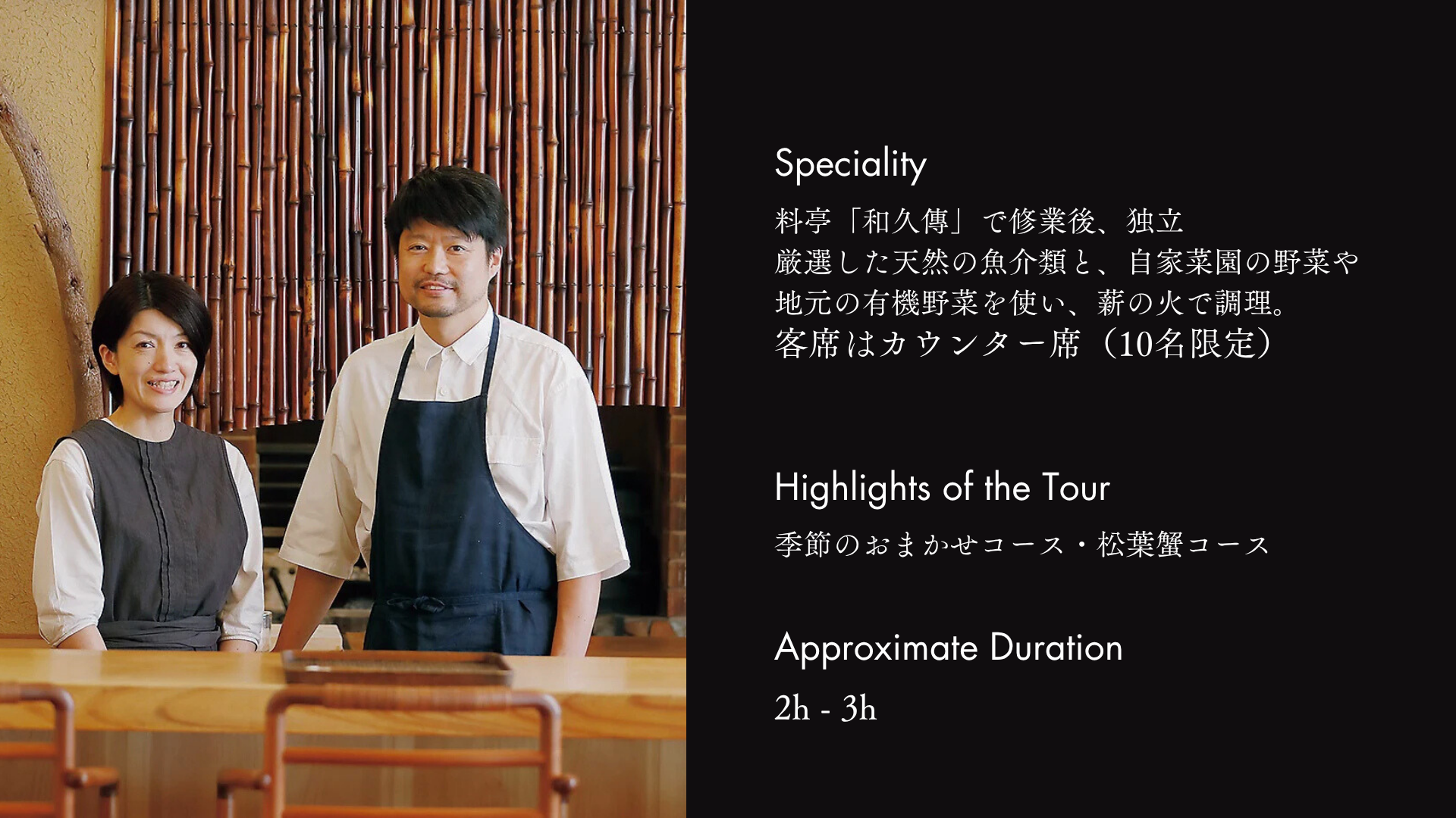 貸切特別コース:このツアーでは、縄屋を貸し切りにし、シェフ 吉岡 幸宣 氏による特別コースをお楽しみいただきます。 丹後の海と大地が育む旬の恵みを、薪火で丁寧に調理。その一皿ごとに、土地の記憶と季節の息づかいが宿ります。