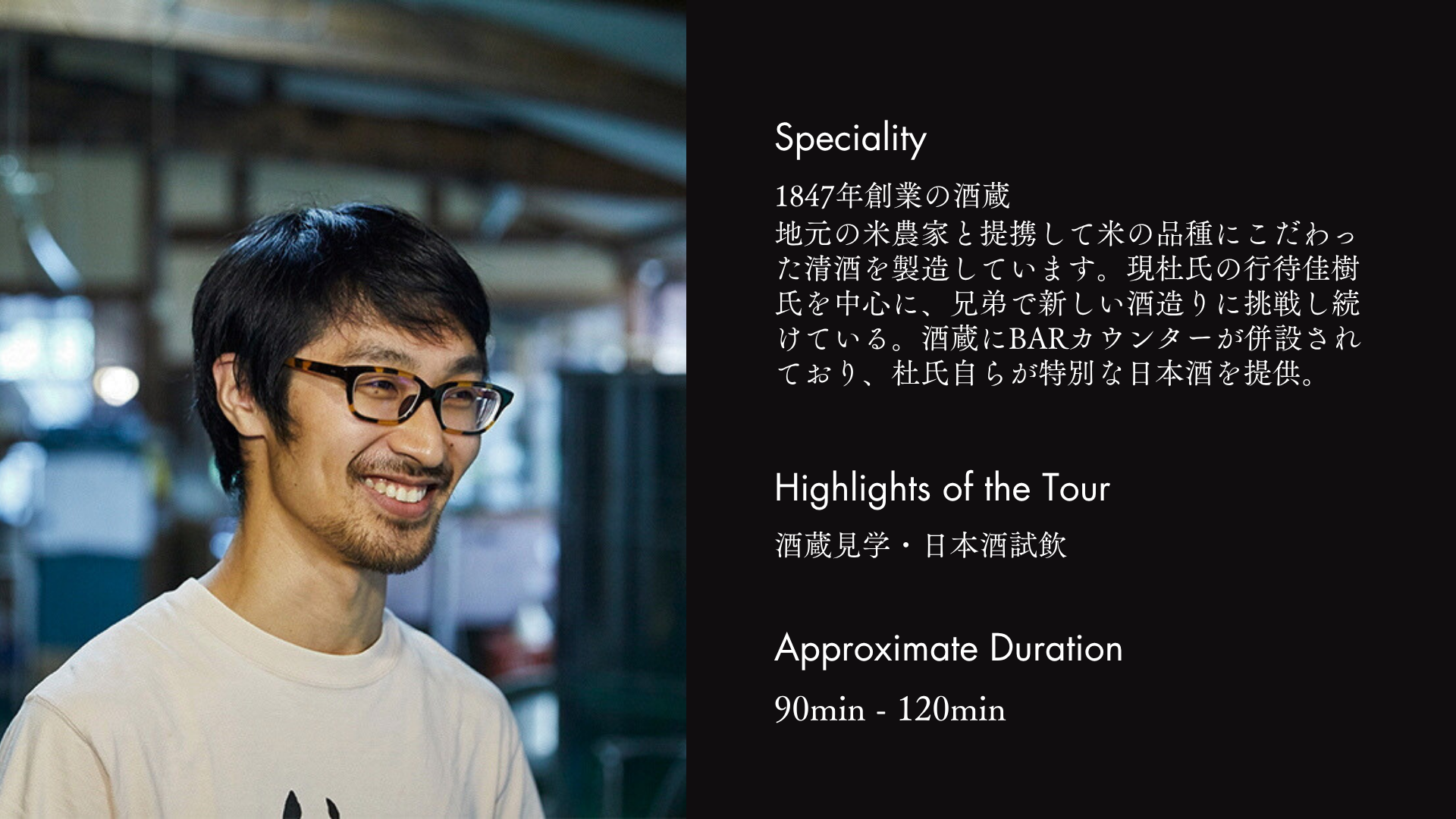 テイスティング体験:蔵元に隣接する洗練されたBarにて、造り手自らが提供する特別な日本酒を味わう時間。