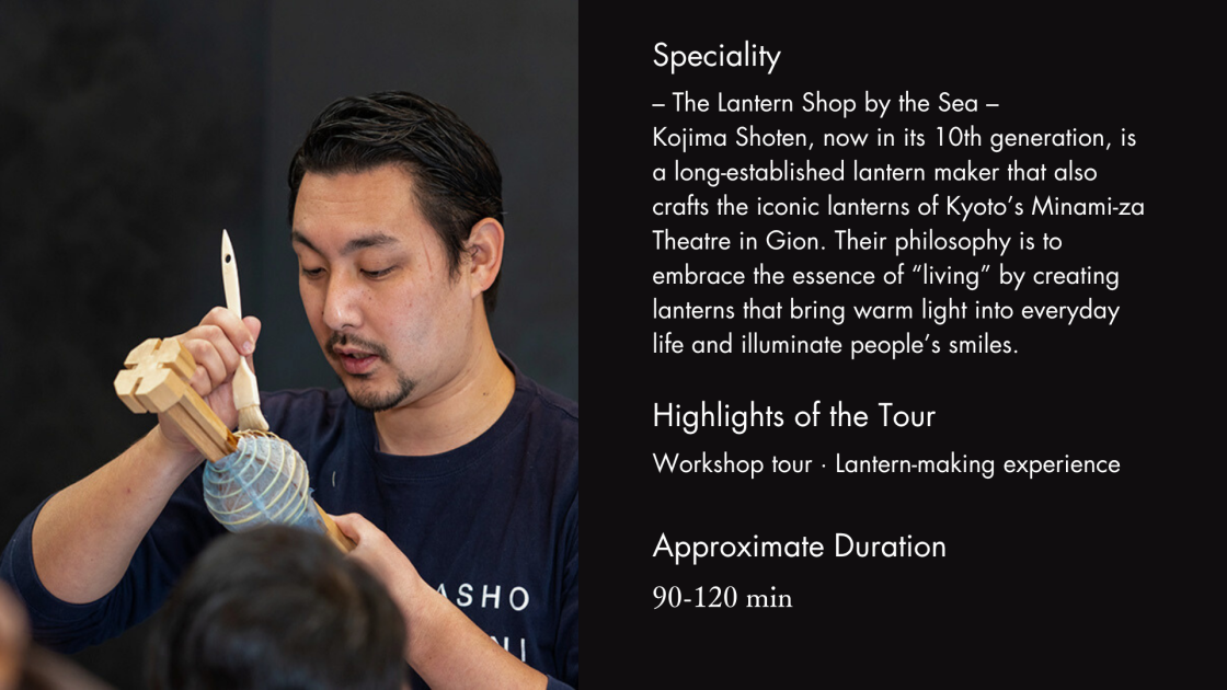 Workshop Tour: Discover the world of lantern-making, crafted one by one with traditional techniques. Observe the meticulous process—from bamboo framework to paper application and painting—and witness the interplay of gentle light and shadow that has accompanied Japanese life for centuries.