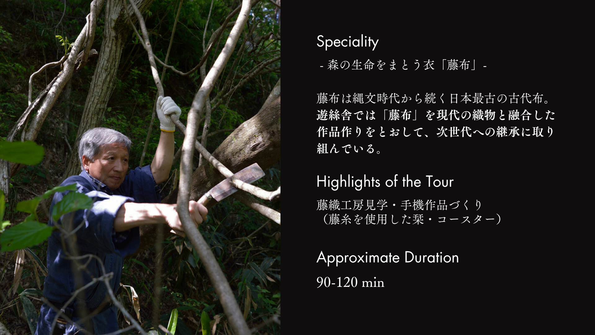 藤布工房見学:縄文時代から受け継がれる日本最古の古代布「藤布」。藤の蔓を裂き、糸を撚り、布へと織り上げていく工程を間近でご覧いただけます。自然と共に生きてきた人々の知恵と、職人の静かな手仕事が織りなす世界を体感してください。