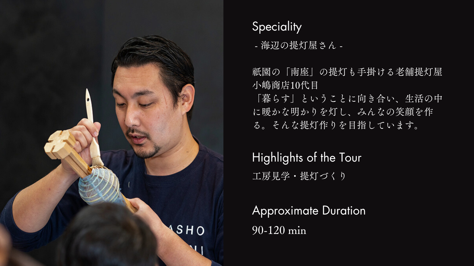 提灯工房見学:伝統の技法で一つひとつ手づくりされる提灯の世界。骨組みから紙貼り、絵付けまで、職人の巧みな手仕事を間近でご覧いただきます。明かりを宿すことで生まれるやわらかな光と影は、日本の暮らしに寄り添ってきた美のかたちです。