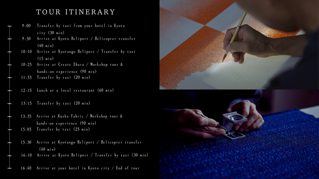 Special Souvenir: Take home an exclusive silk item born of the atelier’s skill and design. Incorporating it into your daily life lets you experience the new lifestyle envisioned through Tango weaving.