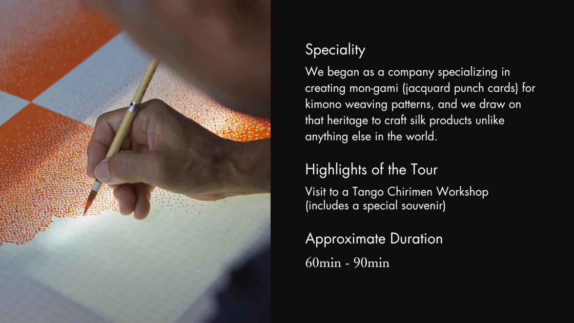 Tango Chirimen Workshop Tour: Observe the meticulous process, from the creation of delicate stencils to the birth of fabric itself. Discover the refined handwork that paints intricate patterns dot by dot, and feel the time and spirit woven into every thread.
