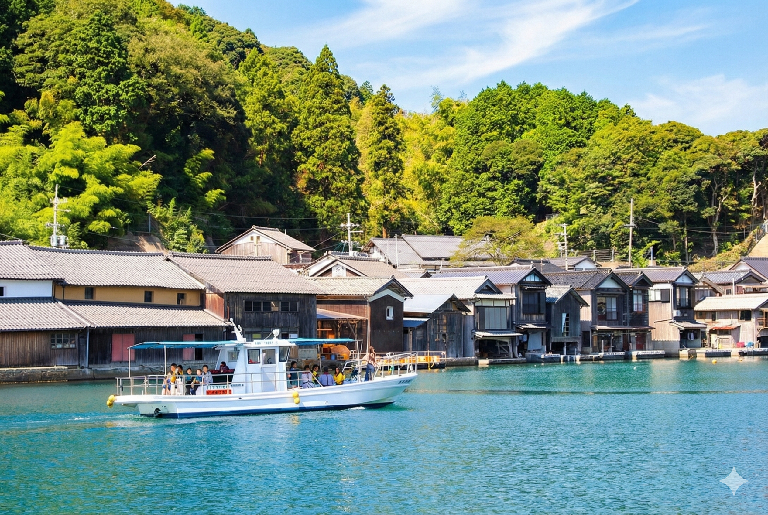 Ine Bay Sea Taxi We use local “Sea Taxis”—small boats guided by fishermen—to explore the harbor. This offers an intimate view of the funaya from the water, an angle impossible to appreciate from land.